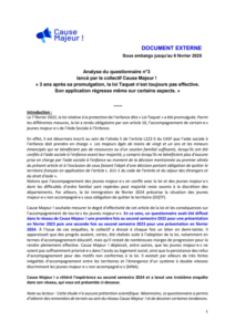 Rapport d’analyse de la troisième enquête du collectif Cause Majeur ! portant sur l’effectivité de la loi du 7 février 2022 relative à la protection des enfants. À partir des retours de professionnel·le·s de terrain, il met en lumière les avancées, les limites et les disparités territoriales dans la mise en œuvre dispositions prévues pour les jeunes majeur·e·s.